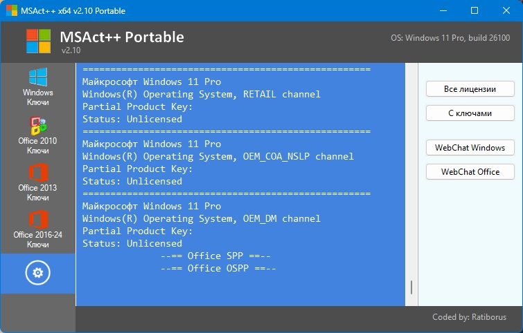Программа предназначена для установки ключей и активации Windows 7-11 и Office 2010-2021. Если установленный ключ допускает активацию по сети, через интернет, продукт активируется автоматически, если этого не происходит и ключ не заблокирован - выдаётся код для передачи в Центр Активации M$ для активации по телефону.