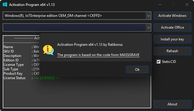 В программе использован код от группы MASSGRAVE "TSforge (c) MASSGRAVE 2025".