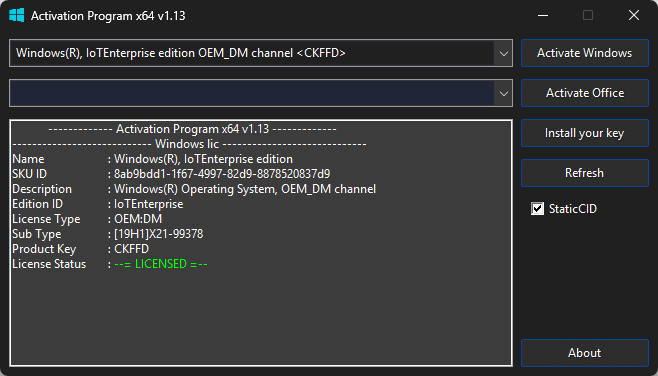 • Если в строке выбора редакции есть "VOLUME_KMSCLIENT" - применяется метод "kms4k" и из системы удаляются записи о KMS сервере.