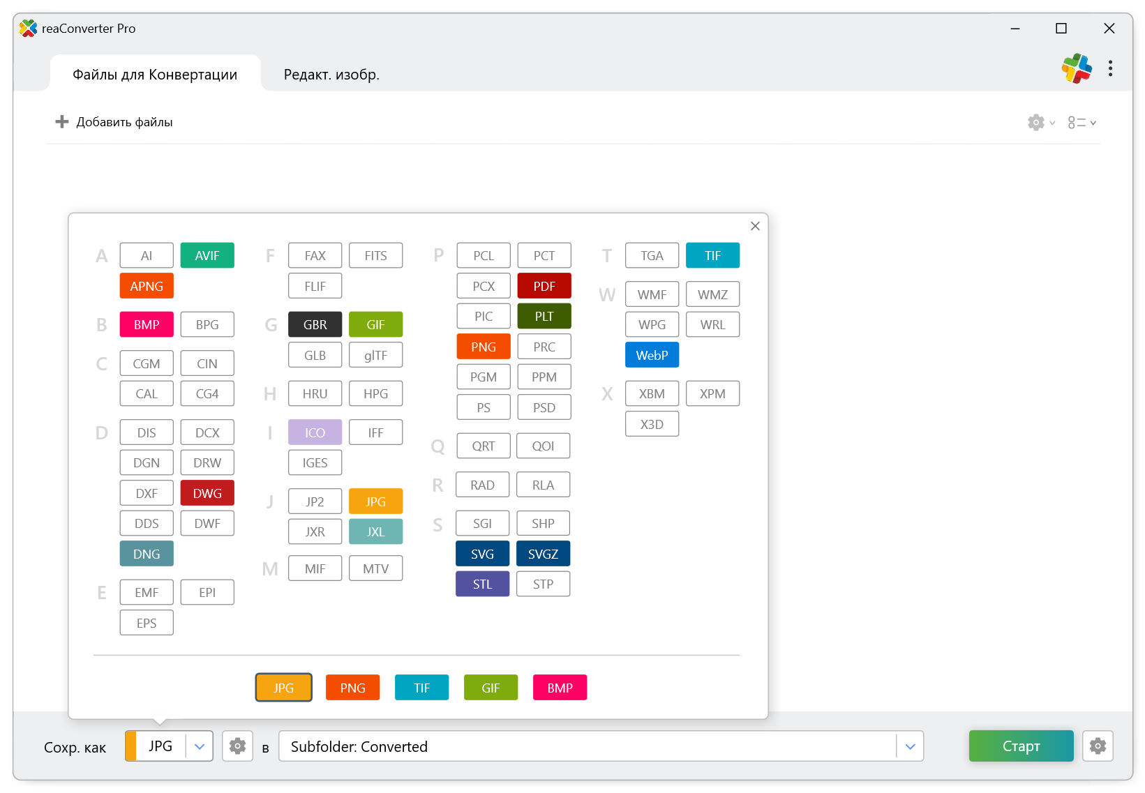 • Преобразовывает графические файлы в любые типы форматов.