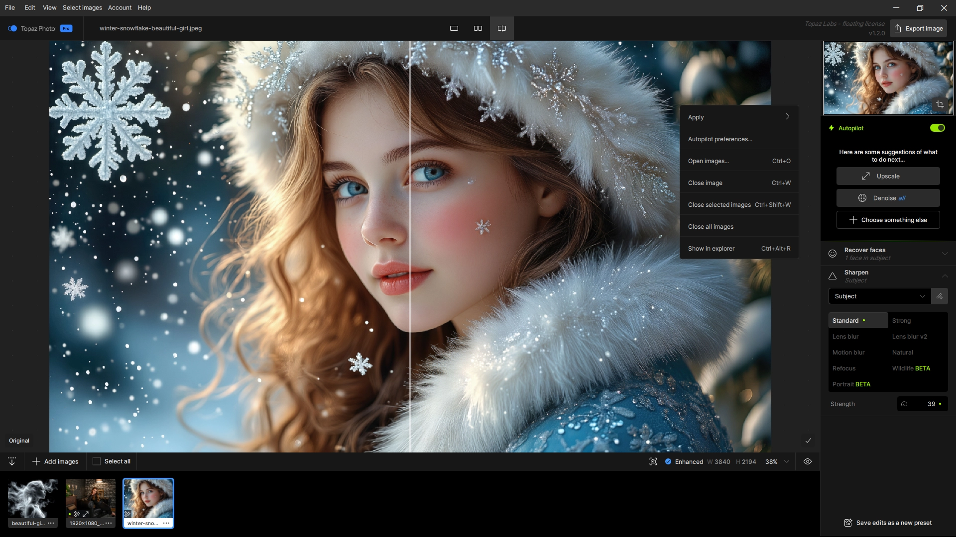 Topaz Photo - это интеллектуальное программное обеспечение для улучшения изображения, которое позволяет вам заострить детали, восстановить фокус и регулировать уровни на каждом снимке. Выбирайте из 11 инструментов на основе ИИ для совершенствования своих изображений, или начните Вашу работу при установках по умолчанию (Автопилот).