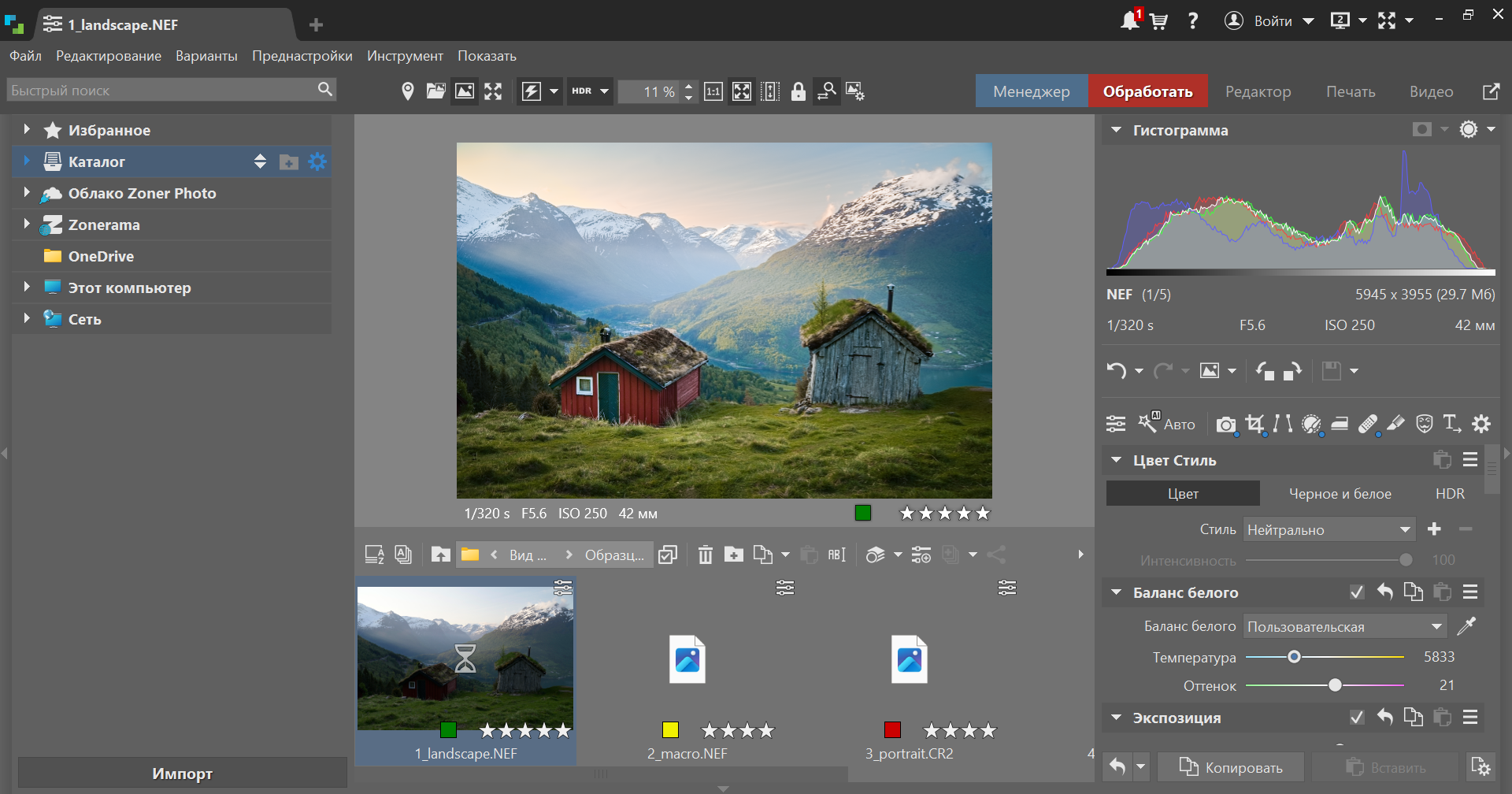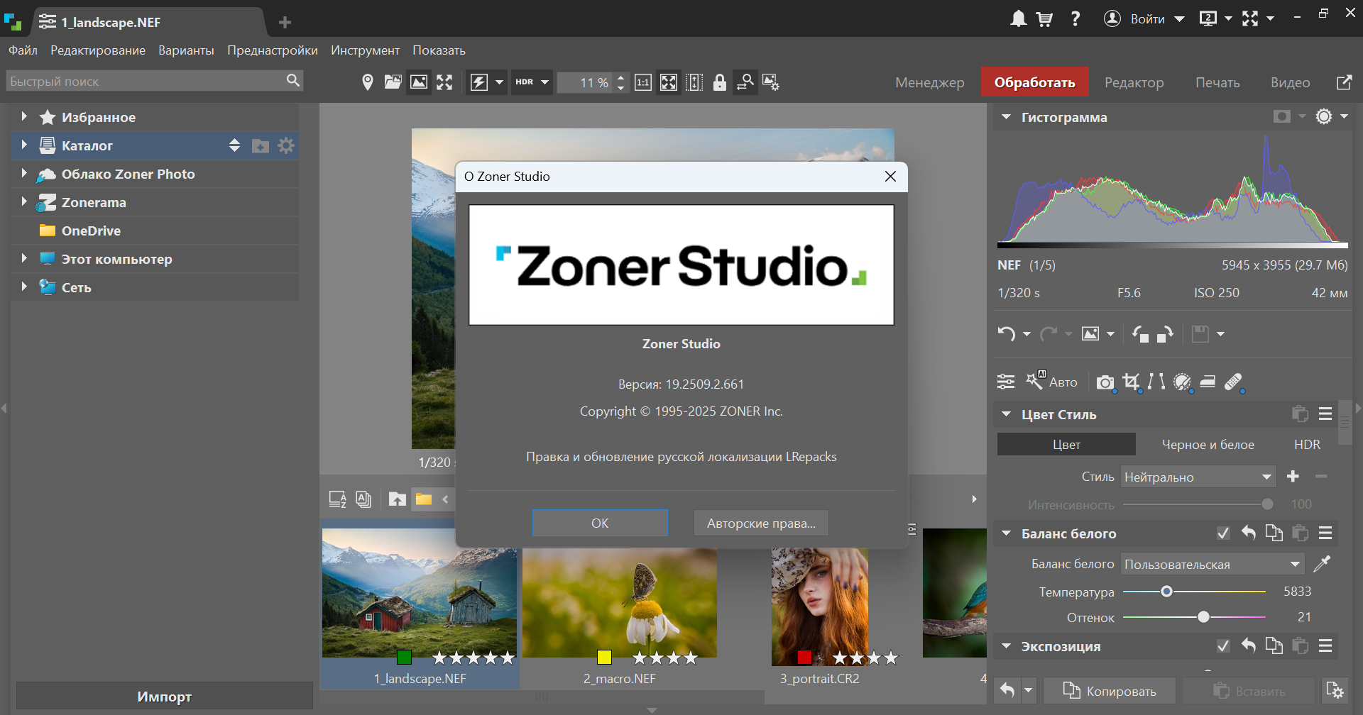 Zoner Photo Studio - это инструмент, который безопасно проведет пользователя через все этапы процесса управления и обработки цифровой фотографии: получение, правка, архивация и публикация. Универсальное решение «все в одном» предоставляет пользователю исключительный комфорт во время работы без необходимости постоянно переходить из одной программы в другую. Профессиональная версия предназначена для всех продвинутых пользователей цифровых фотоаппаратов и сканеров, которые хотят легко, быстро и эффективно обработать свои фотографии. Программа содержит обширный набор инструментов для комплексной обработки цифровой фотографии на компьютере. Ее качества оценит каждый опытный пользователь цифрового фотоаппарата.