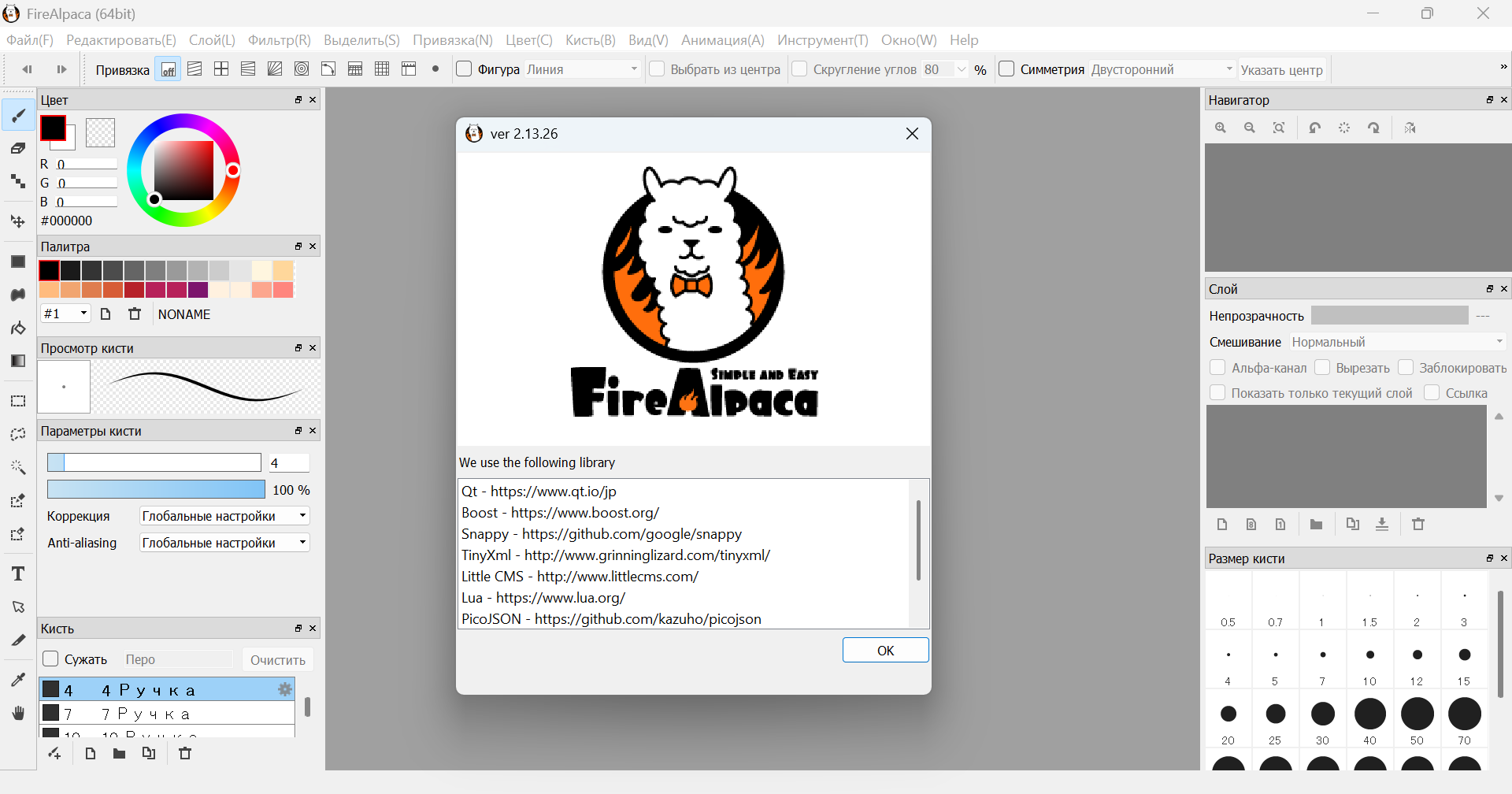 FireAlpaca - это достаточно простой, но удобный графический редактор для преобразования изображений, фотографий и любых других картинок. Здесь нет каких-то продвинутых или специфических функций, но базовый набор инструментов позволяет быстро и легко редактировать нужные изображения.