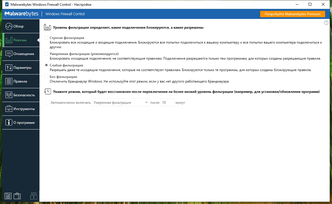 • Режим Обучения, который обеспечивает уведомления о заблокированных исходящих соединениях.
