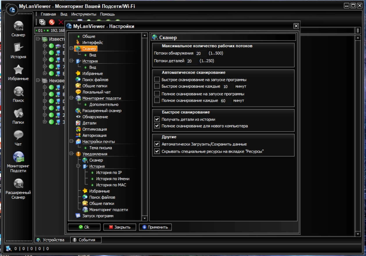 • Сохранение списков всех ранее найденных компьютеров в сети;