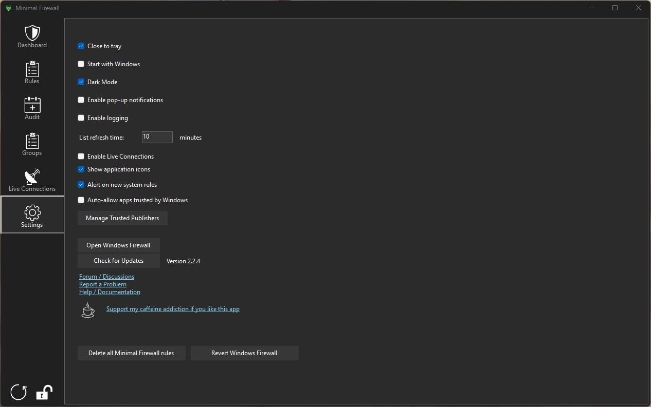 • Портативность: Minimal Firewall — это один исполняемый файл, не требующий установки. Все правила встроены в брандмауэр Windows, поэтому не нужно устанавливать дополнительные драйверы или службы.