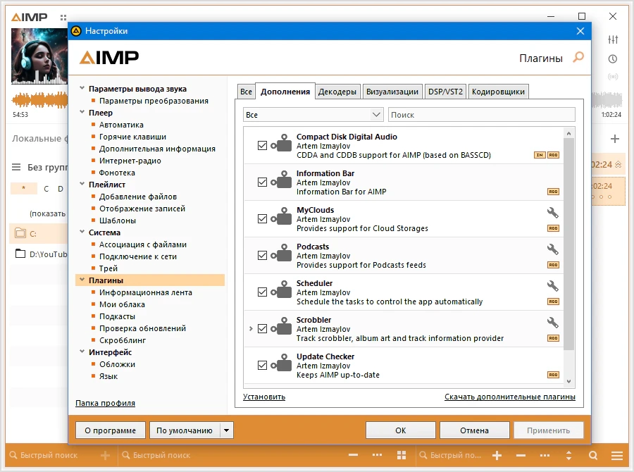 Интерфейс полностью на русском языке с поддержкой других, куча дополнительных функций, возможность настроить частоту с помощью эквалайзера, различные специальные эффекты, визуализации, поддержка плагинов, которая существенно расширит возможности плеера, редактор тегов, библиотека и так далее.