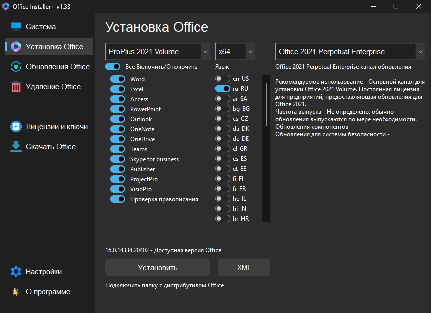 Office Installer - программа предназначена для online и offline установки Office 2016/2024 C2R. Так же имеется возможность создать свой дистрибутив Office для последующей установки Office offline.
