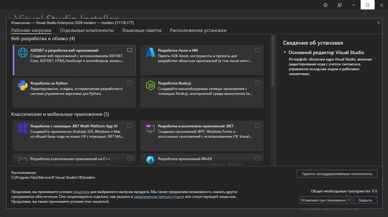 • Для установки Visual Studio необходима среда выполнения WebView2. Если она еще не установлена, то будет установлена во время настройки. Установка Visual Studio завершится сбоем, если не удастся успешно установить WebView2 (из-за ошибки установки или ограничений групповой политики на установку или обновление).