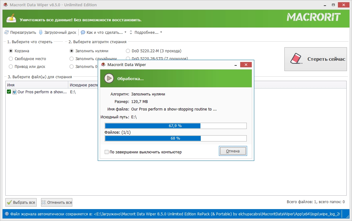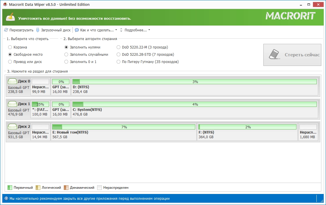 Macrorit Data Wiper Unlimited Edition – мощная утилита, которая поможет вам полностью очистить диск. Если вы хотите удалить данные с жесткого диска, форматирования или простого удаления недостаточно, чтобы защитить свои личные данные или корпоративные документы от восстановления. Вам нужен профессиональный инструмент по очистке диска, который полностью сотрет все данные диска или раздела. Мощные алгоритмы программы Macrorit Disk Partition Wiper обеспечивают простое в использовании решение для полного уничтожения данных без возможности восстановления.