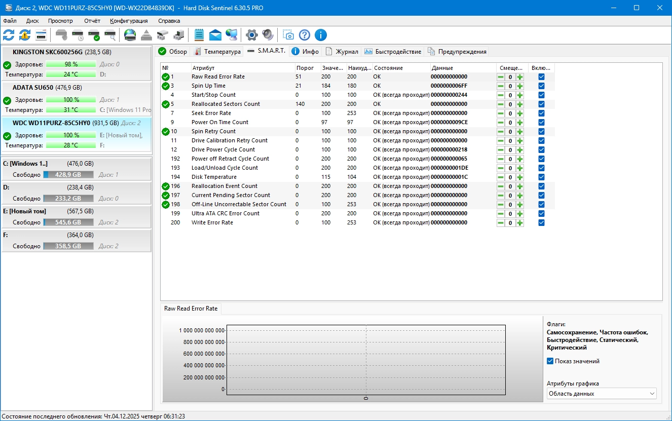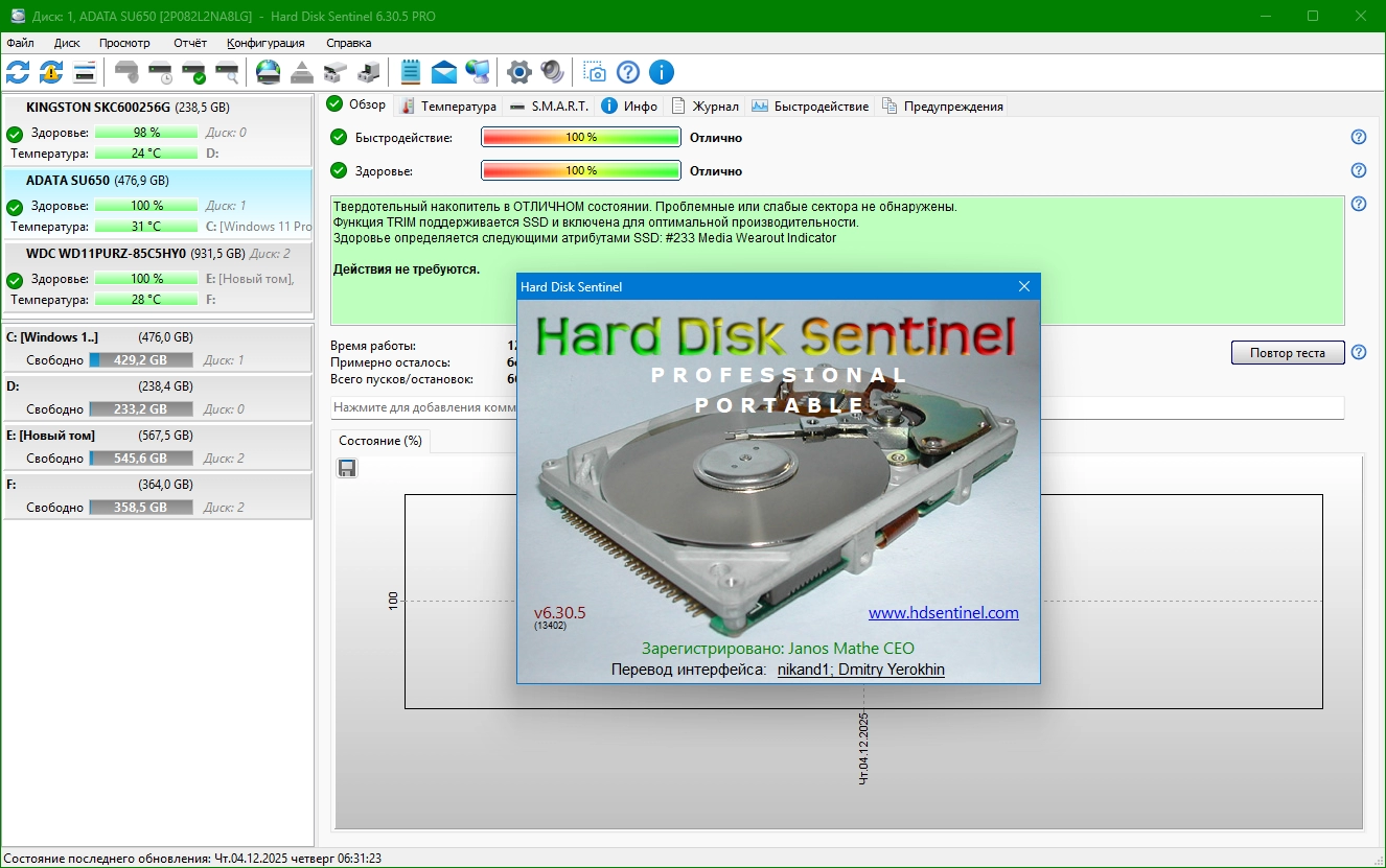 Hard Disk Sentinel Pro — отличная программа для мониторинга состояния HDD/SSD носителей. Сейчас как никогда важна информация, хранящаяся на них. Сам неоднократно сталкивался со случаями, когда пользователи не делали резервных копий важных файлов, а потом сильно расстраивались из-за их потери. Сами подумайте - работа, семейный архив фото/видео, а также другая информация, которая представляет ценность, может вмиг исчезнуть. За восстановление нынче берут большие деньги, поэтому лучше предупреждать подобные ситуации - хранить копии на других устройствах и в облачных сервисах. Hard Disk Sentinel покажет здоровье ваших дисков и подскажет, стоит ли заменить какие-либо из них. Имеется планировщик, отчёты, различные тесты. Сохраните ваши файлы сегодня.