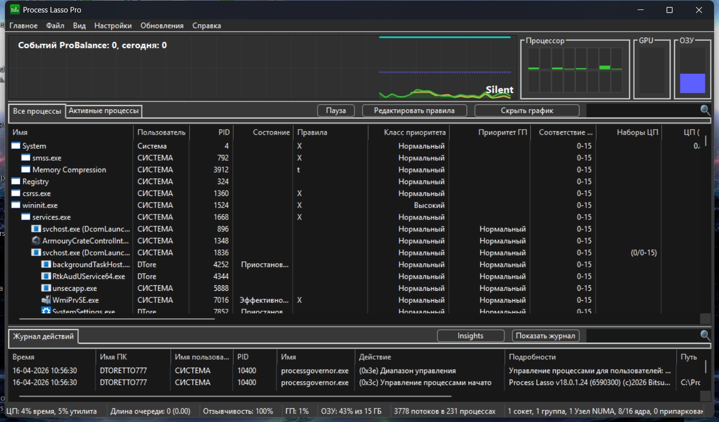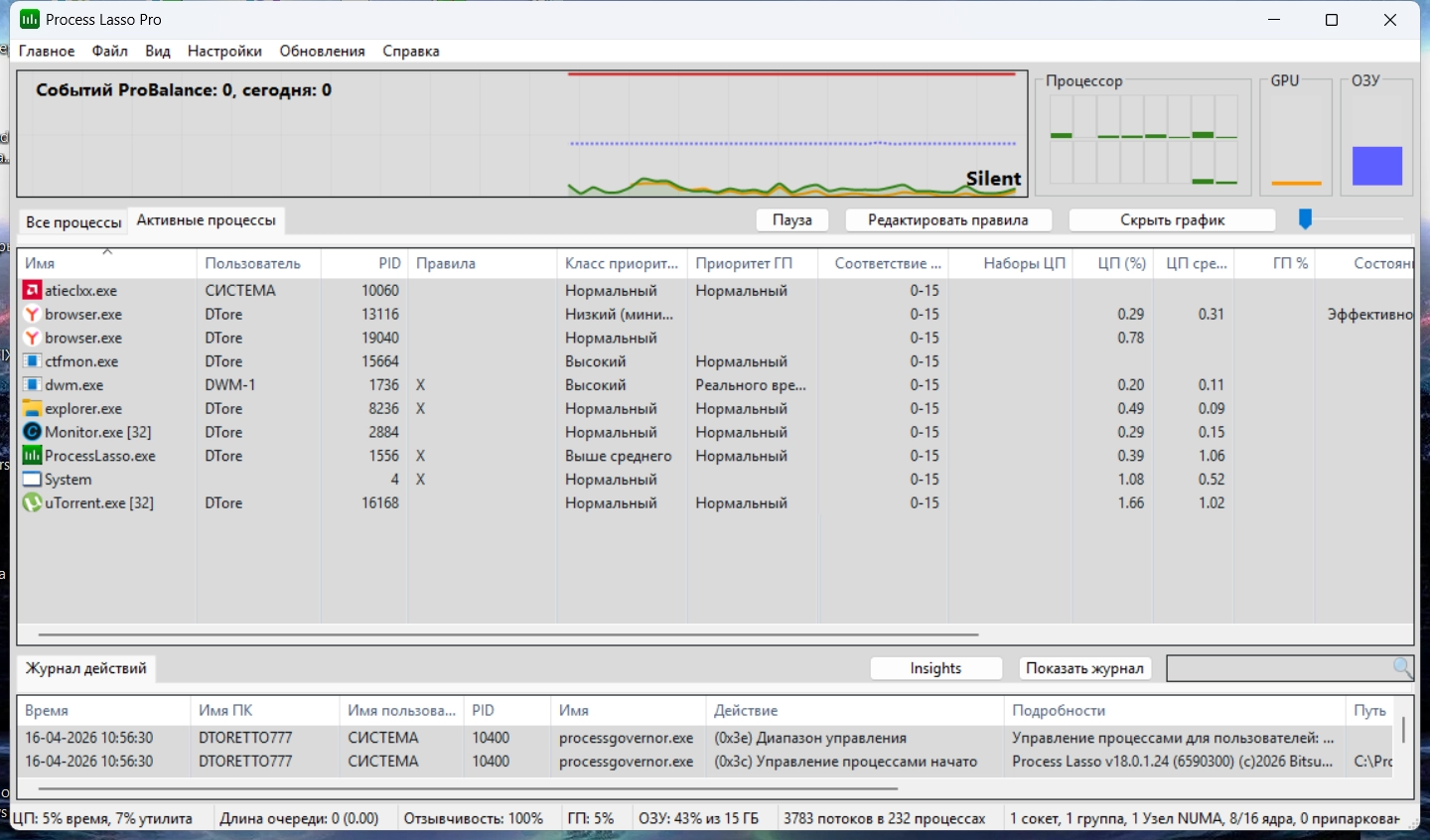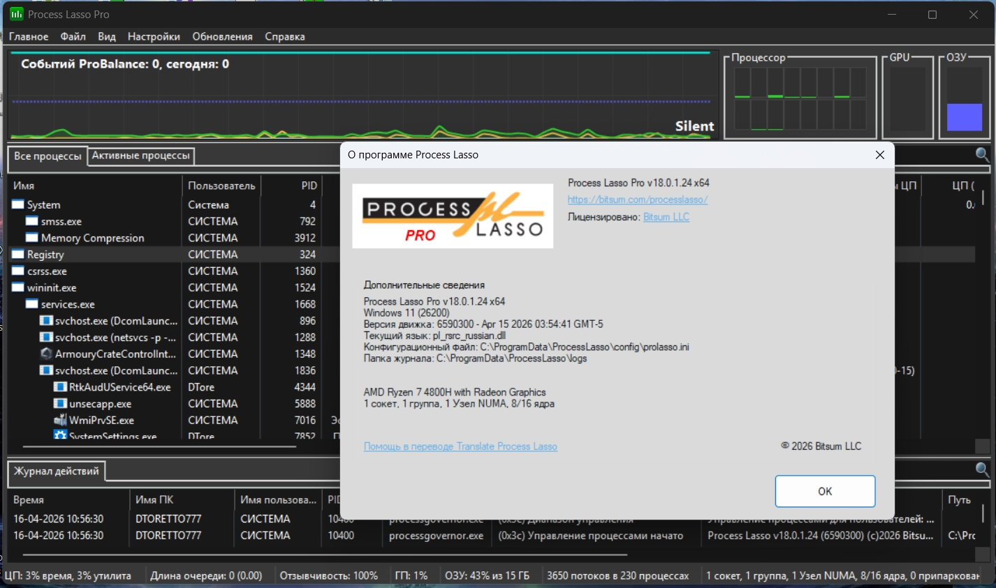 Process Lasso позволяет вручную или автоматически манипулировать запущенными на компьютере процессами, что позволяет добиться максимального быстродействия и стабильности системы. Process Lasso наблюдает за программами, активно загружающими центральный процессор и ограничивает их, тем самым улучшая системный отклик. Также она может автоматически снизить приоритет для процесса, применив заданные по умолчанию значения. Windows, по умолчанию, позволяет программам полностью загружать центральный процессор, что ведёт к зависанию системы и, соответственно, к неудобству работы. Технология ProBalance (Process Balance) программы Process Lasso аккуратно перераспределяет приоритеты запущенных программ, так что процессы, которые ранее загружали весь центральный процессор, больше не будут влиять на отклик системы.