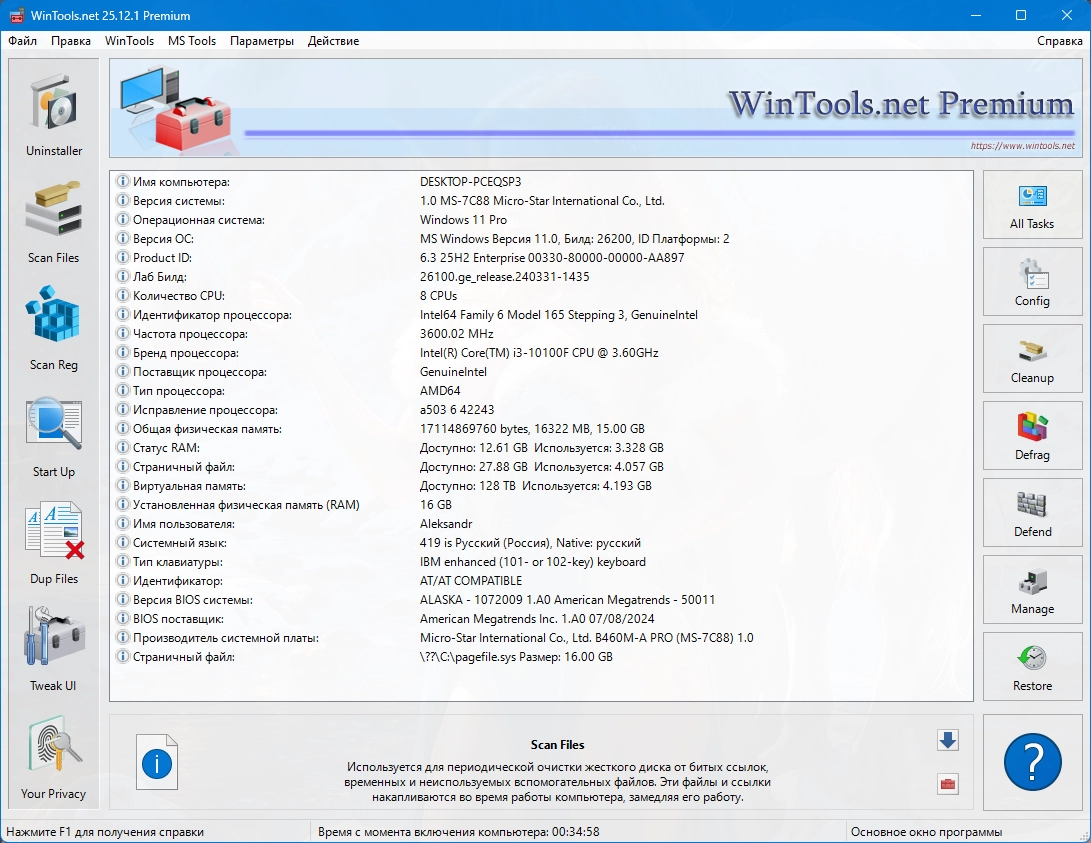 При работе различных программ на жёстком диске создаются временные файлы необходимые для их правильной работы. Достаточно часто происходят ситуации, когда временные файлы не удаляются (зависание компьютера или программ, не корректный выход из программы или системы) и остаются на жестком диске захламляя его и безосновательно занимая пространство. Иногда большое количество временных файлов замедляет загрузку компьютера и работу в целом. Для периодической очистки компьютера от временных и не используемых файлов служит инструмент «Scan Files».
