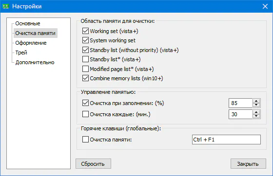 • Настройка очистки памяти
