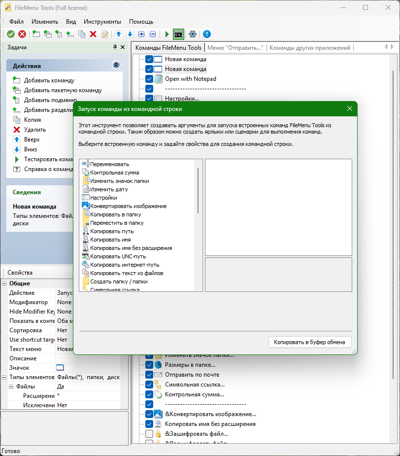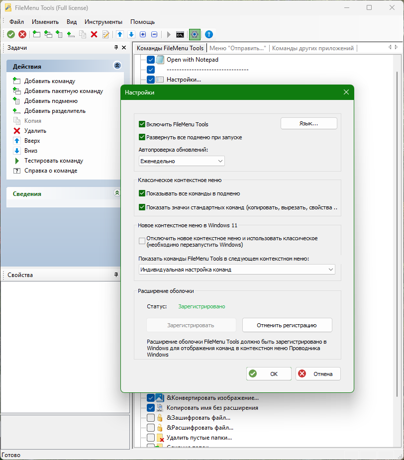 FileMenu Tools настраивает пункты контекстного меню проводника Windows, позволяя самостоятельно составить список нужных команд. Одним щелчком мыши можно переименовать, скопировать, переместить, удалить файлы, запустить нужные программы, скопировать выделение в буфер обмена, вызвать антивирусный сканер, открыть интернет-ссылки и многое другое. Программа позволяет задать порядок размещения пунктов меню, разделить их по группам, создать подменю с нужными пунктами, использовать команды из предопределенного набора или добавить свои команды с указанием дополнительных параметров. Ещё одна отличительная особенность данной программы – возможность управления пунктами меню, которые были созданы при установке других программ, а также, быстрое редактирование меню «отправить».