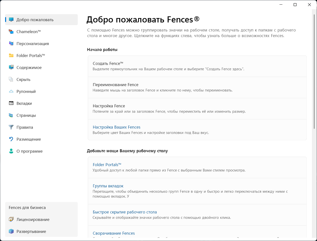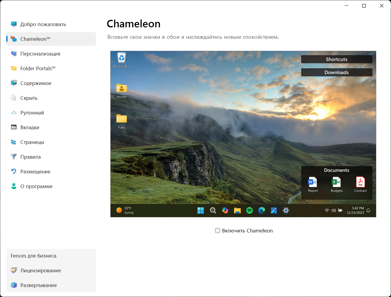 Fences упорядочивает рабочий стол, размещая приложения, файлы и значки в удобные и настраиваемые макеты. Fences позволяет легко упорядочивать рабочие столы по проектам, типам файлов, спринтам и многому другому. Благодаря мощному набору правил автоматизации, настройте скрипты один раз, и Fences автоматически организует контент.