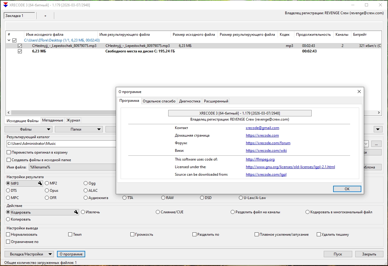 XRecode3 — популярный и мощный аудио конвертер, обладающий удобным «drag and drop»-интерфейсом и поддерживающий большинство распространенных форматов, который позволяет быстро и без особого труда преобразовывать аудио-данные. Поддерживается извлечение аудио дорожки из видео файлов и граббинг многоканальных Audio CD. Возможность создания одного большого аудио файла из нескольких и создание .CUE файла.