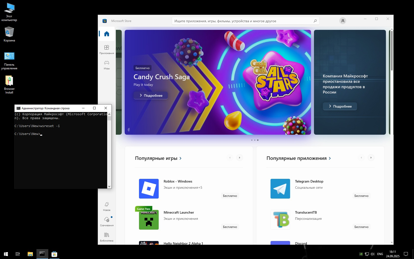 • Microsoft Store можно вернуть командой wsreset -i