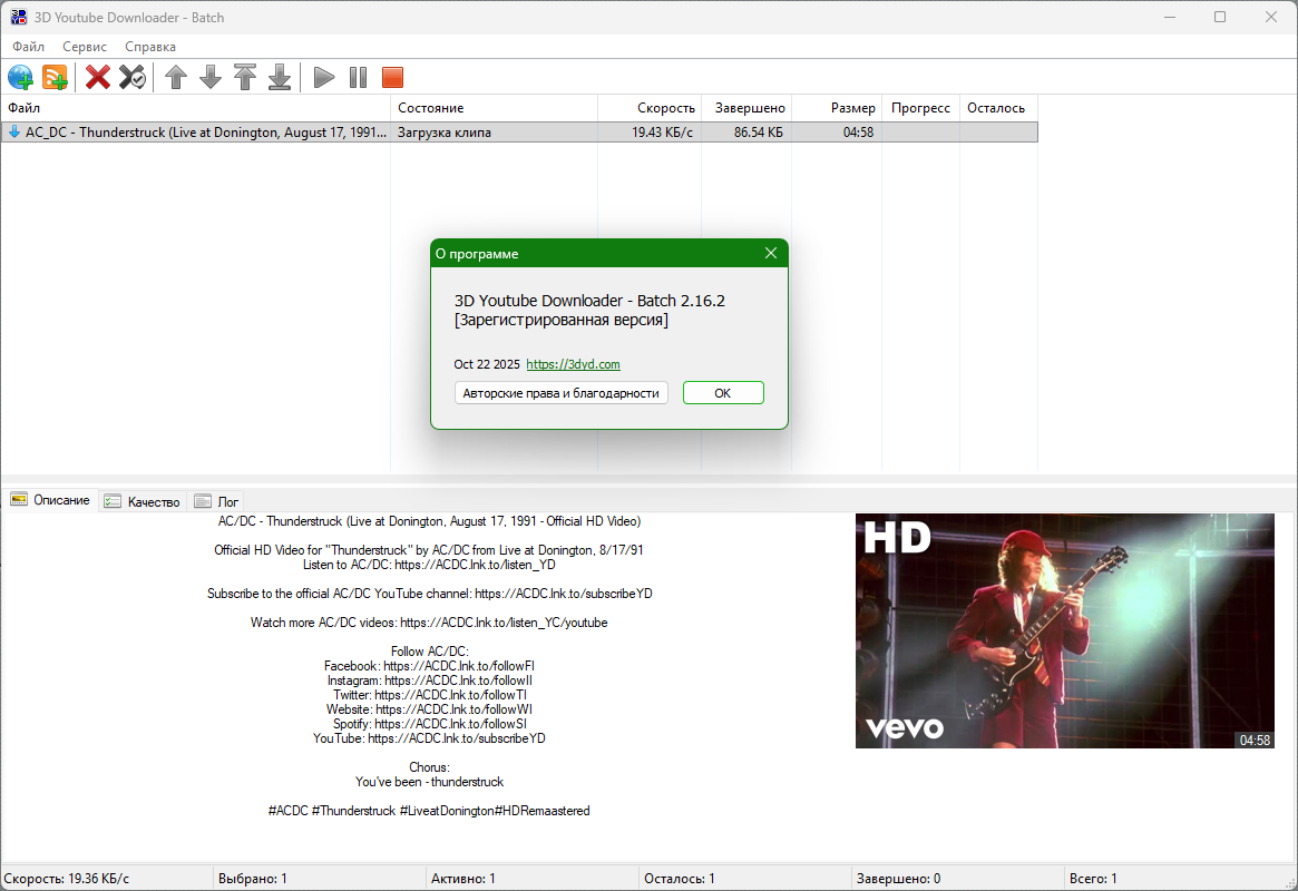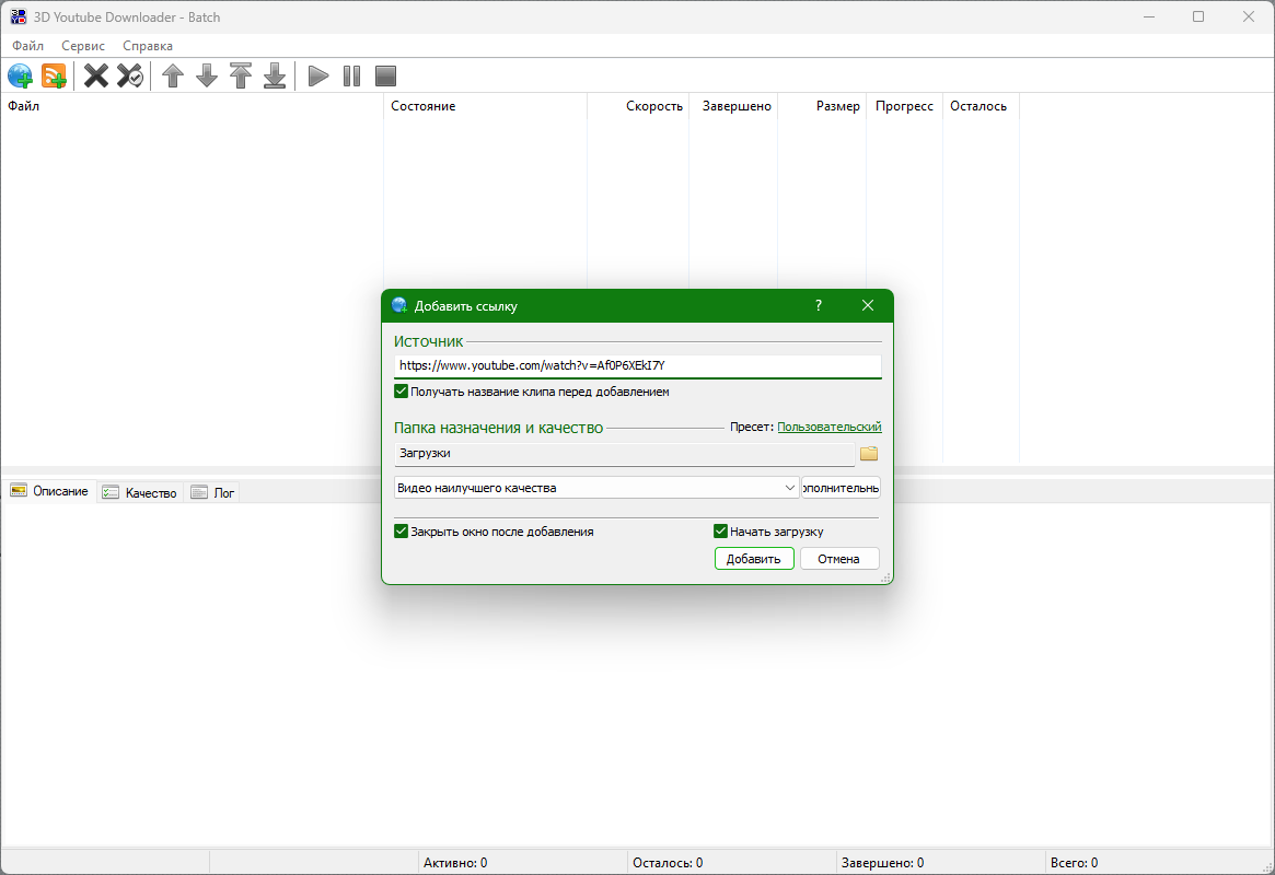 3D Youtube Downloader - Batch - это продвинутый инструмент для пакетной загрузки нескольких клипов и целых плейлистов. Монитор буфера обмена, предустановки вывода и несколько способов добавления URL-адресов позволяют легко добавлять несколько клипов. Панель свойств предоставляет широкие возможности для дальнейшей настройки и управления для каждого клипа.