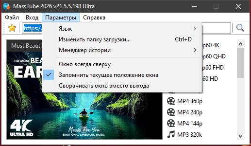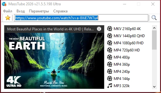 MassTube — очень простая в использовании программа для скачивания видео с YouTube (и не только) с помощью одного клика. Достаточно в строку поиска вставить адрес понравившегося ролика и нажать поиск, после чего программа предоставит список форматов и разрешений, в которых можно быстро скачать данный клип.