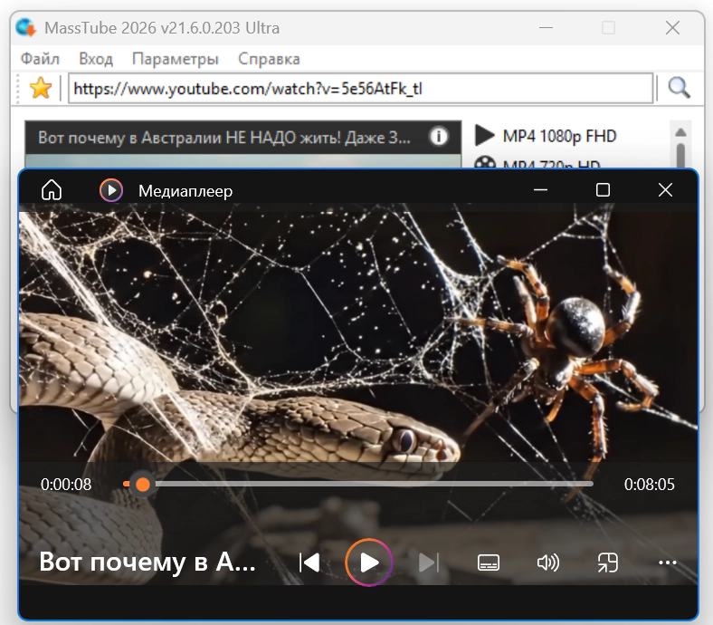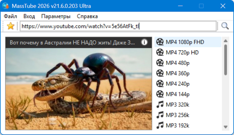 MassTube — очень простая в использовании программа для скачивания видео с YouTube (и не только) с помощью одного клика. Достаточно в строку поиска вставить адрес понравившегося ролика и нажать поиск, после чего программа предоставит список форматов и разрешений, в которых можно быстро скачать данный клип.