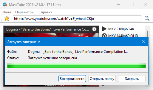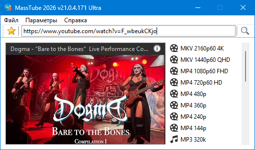 MassTube — очень простая в использовании программа для скачивания видео с YouTube (и не только) с помощью одного клика. Достаточно в строку поиска вставить адрес понравившегося ролика и нажать поиск, после чего программа предоставит список форматов и разрешений, в которых можно быстро скачать данный клип.