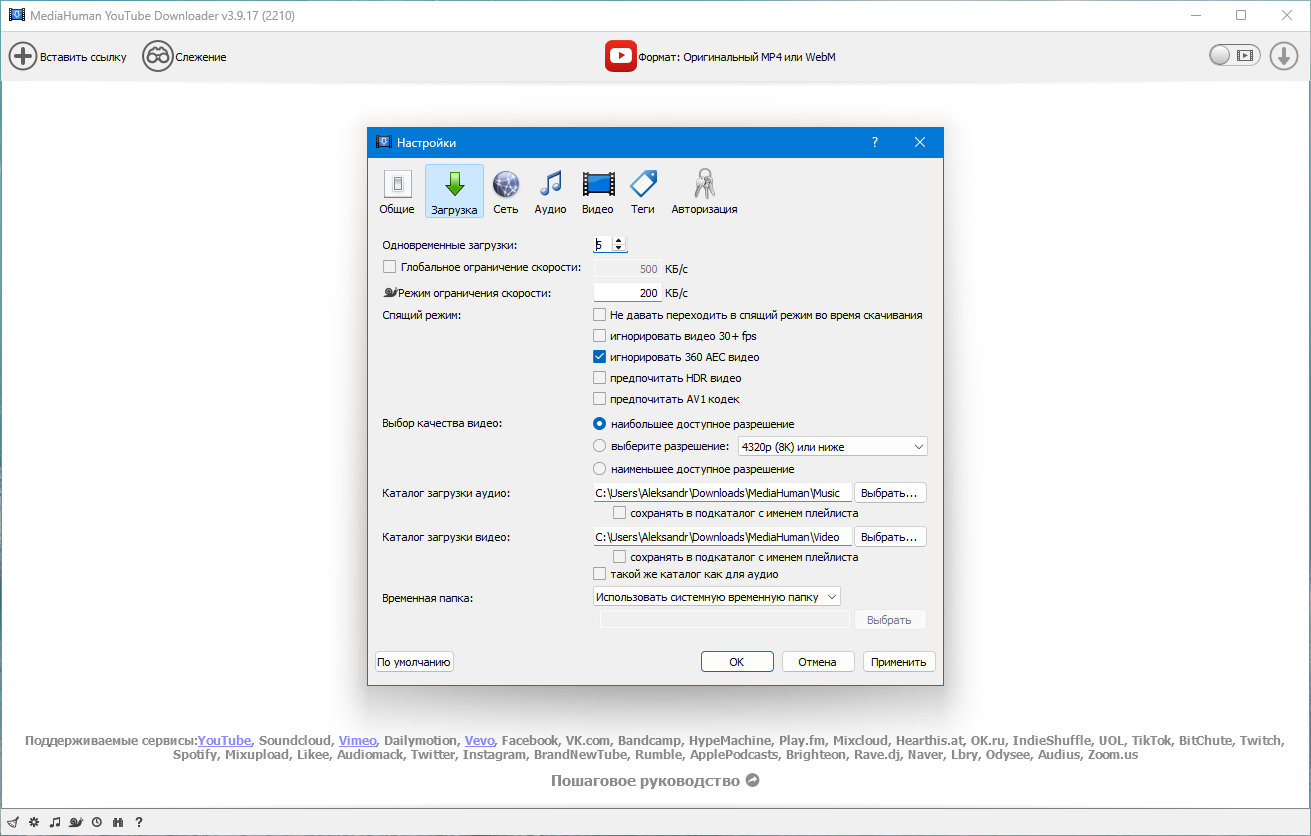 Программа поддерживает загрузку всех доступных разрешений, но выбор остается за вами, будет это 720p, 1080p, 4K или 8K, 60 fps или 30.